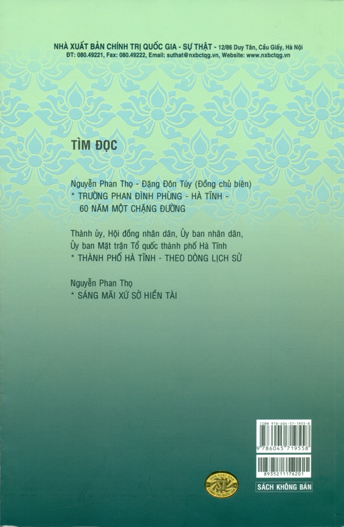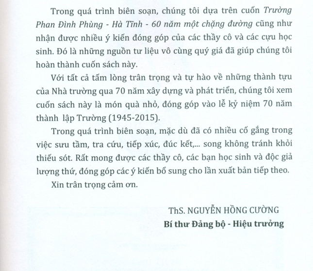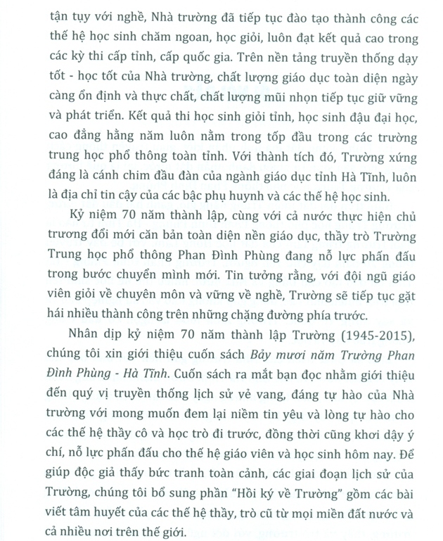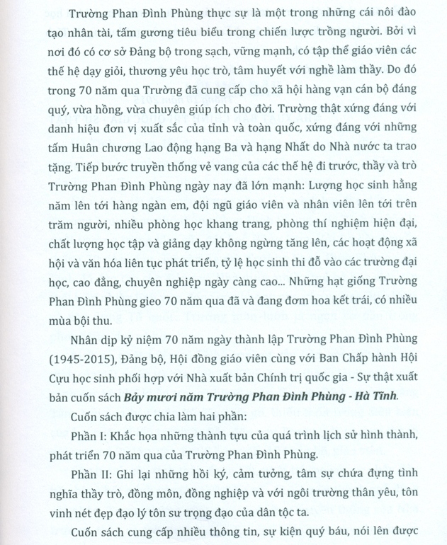 (vanhocnghethuathatinh.org.vn) Nhân dịp kỷ niệm 70 năm thành lập Trường THPT Phan Đình Phùng Hà Tĩnh. Hội liên hiệp VHNT Hà Tĩnh xin giới thiệu cuốn sách "70 năm Trường Phan Đình Phùng Hà Tĩnh" do Nhà xuất bản Chính trị Quốc gia phát hành