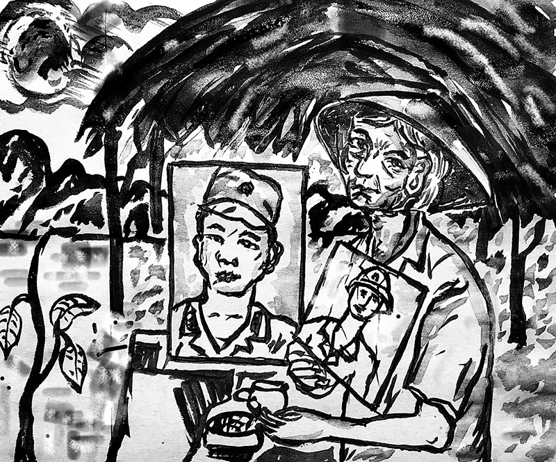 Phải mất ngót một ngày, tôi mới tìm được địa chỉ ở đợ của bà cụ 82 tuổi, là mẹ của hai liệt sỹ. Khi con chó còi cọc vừa hóc hách mấy tiếng. Cô chủ lóng ngóng chạy vô tìm bà ở. Tiếng gọi líu ríu nửa như lo sợ nửa như vui mừng:
