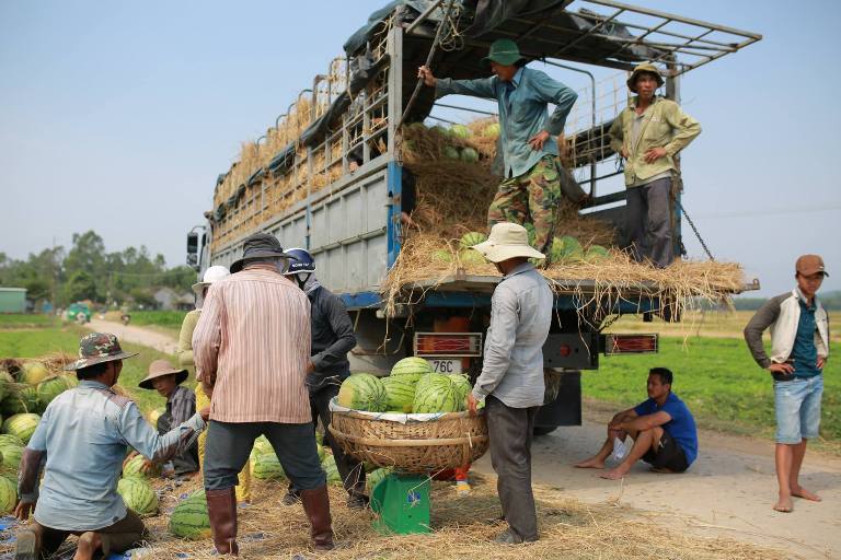 Dưa được vận chuyển từ ruộng lên xe tải