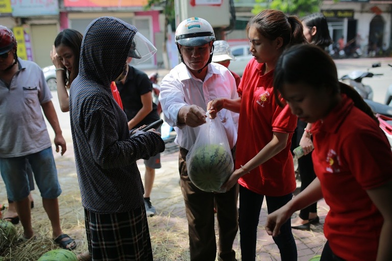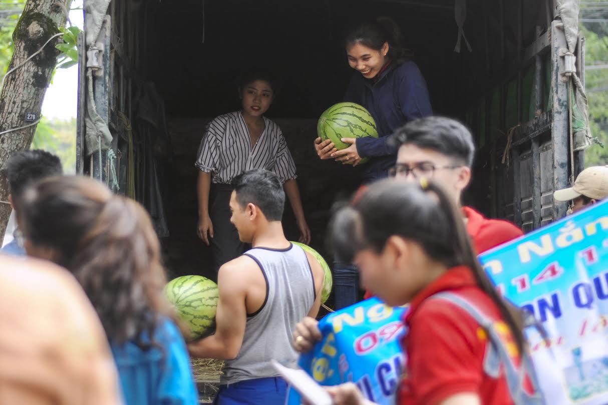 Tại điểm bán dưa hấu, ai cũng cảm thấy vui khi có thể góp một phần bé nhỏ giúp bà con Quảng Ngãi