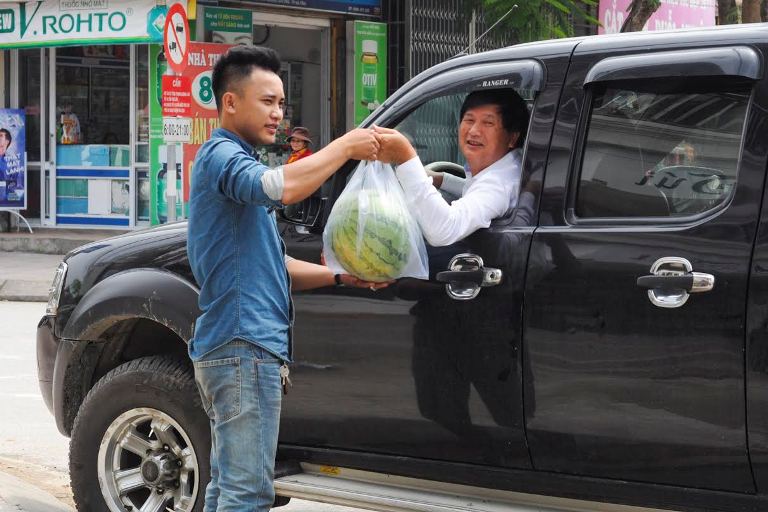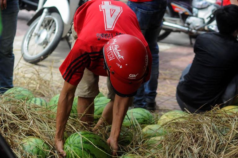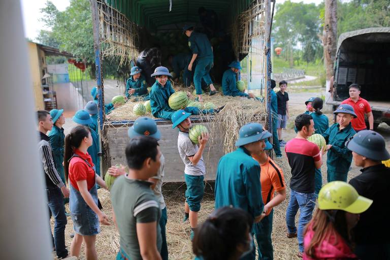 Các bạn trẻ chuyền tay nhau từng trái dưa xuống địa điểm bán