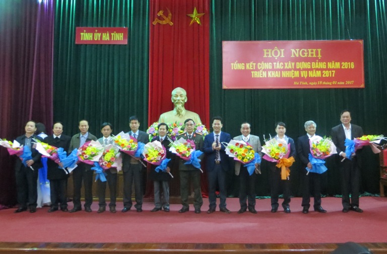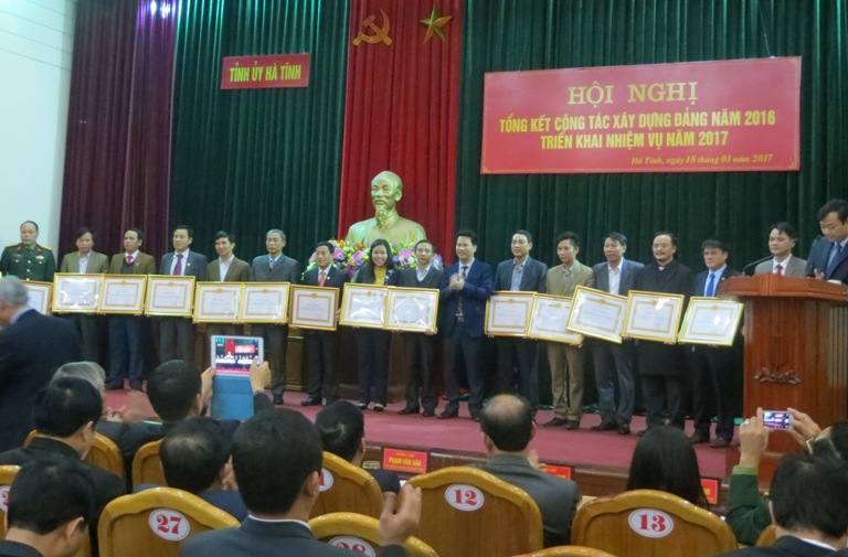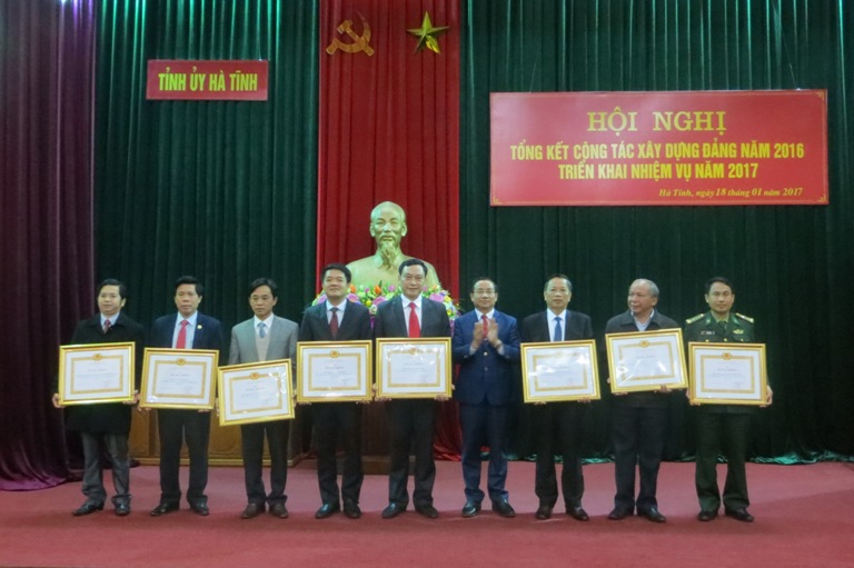 Nhân dịp này, Ban Thường vụ Tỉnh ủy Hà Tĩnh đã trao tặng Bằng khen cho 8 tập thể, 46 tổ chức cơ sở Đảng có thành tích xuất sắc trong công tác xây dựng Đảng năm 2016; biểu dương 24 cá nhân, 3 đoàn công tác của BTV Tỉnh ủy tại địa phương, cơ sở.