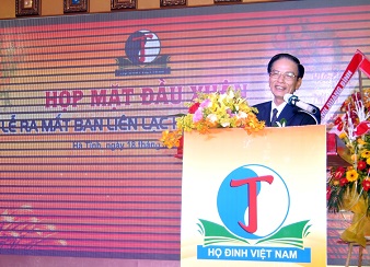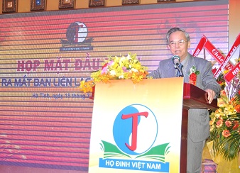 Phát biểu tại buổi gặp mặt,GS-TS Đinh Xuân Dũng(TBLL họ Đinh VN) đã phát biểu ghi nhận sự nỗ lực của BLL lâm thời. Cảm kích trước tình cảm to lớn của các đoàn đại biểu họ Đinh đến từ các tỉnh,thành trên cả nước,và bà con họ Đinh Hà Tĩnh đã giành cho ông Đinh Xuân Dũng những tình cảm trìu mến,thân thương và kinh trọng. Trong bài phát biểu của mình,ông Đinh Xuân Dũng đã tâm tư,trao đổi,nhắc nhở và kêu gọi toàn thể con,cháu trong dòng tộc họ Đinh “hãy nêu cao tinh thần trách nhiệm và ý thức của mình đối với dòng tộc mỗi khi làm một việc gì đều phải suy nghĩ và hành động cho đúng,bới minh là con cháu họ Đinh, hãy tích cực trong học tập,cần cù trong lao động,gương mẫu trong công tác,luôn luôn ghi lòng,tạc dạ truyền thống ngàn năm văn hién mà cha ,ông ta đã tạo dựng. Là con cháu họ Đinh Tiên Hoàng, mỗi một chúng ta cần phải biết đoàn kết,yêu thương,nâng niu và bảo vệ những giá trị,cốt cách to lớn ấy mà cha ông đã để lại cho con cháu muôn đời sau”.