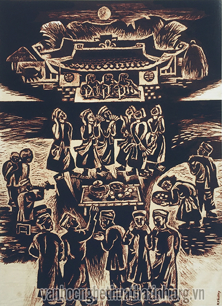 Hát ví Phường Vải – Chất liệu khắc gỗ - Kích thước 60x90 cm – Triển lãm mỹ thuật khu vực Bắc Miền Trung 2006