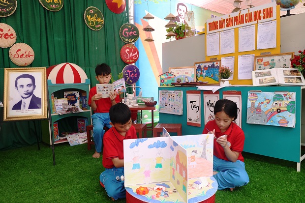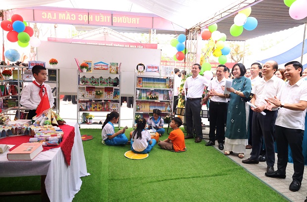 Các đồng chí lãnh đạo, các thầy cô giáo cùng các em học sinh cùng tham quan các gian hàng trưng bày, giới thiệu sách của các đơn vị.
