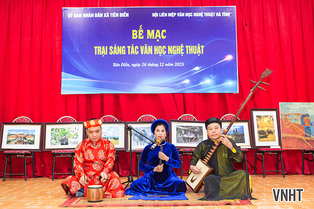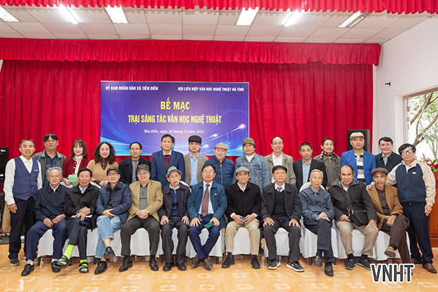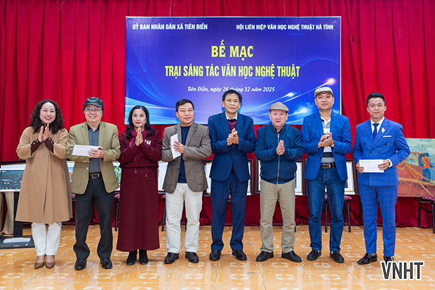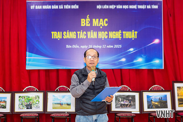 Sáng nay 26/12/2025, Hội Liên hiệp VHNT Hà Tĩnh tổ chức bế mạc Trại sáng tác VHNT khu vực phía Bắc Hà Tĩnh. Trại sáng tác được tổ chức từ ngày 3/12 đến ngày 25/12/2025 tại xã Tiên Điền, tỉnh Hà Tĩnh với sự tham gia của các tác giả thuộc các chuyên ngành thơ, văn xuôi, mỹ thuật, nhiếp ảnh, văn nghệ dân gian, sân khấu biểu diễn.