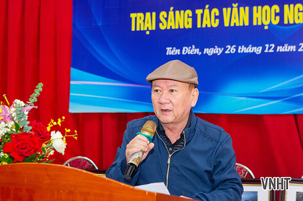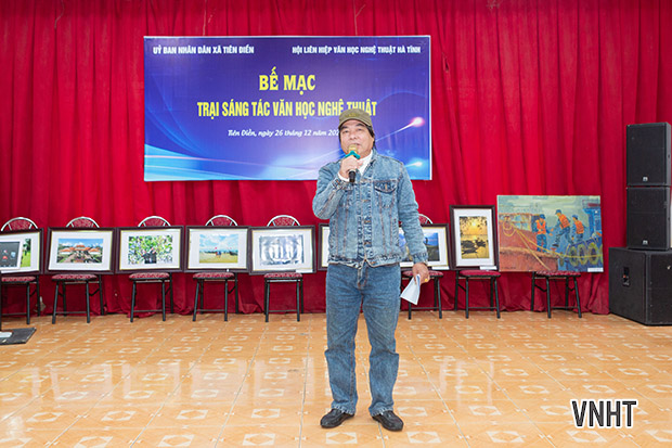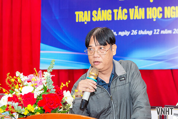 Đại diện trại viên khu vực phía Bắc - Tác giả Trần Vũ Thìn phát biểu cảm tưởng, chia sẻ những trải nghiệm và cảm xúc trong thời gian tham gia Trại sáng tác tại Nghi Xuân.