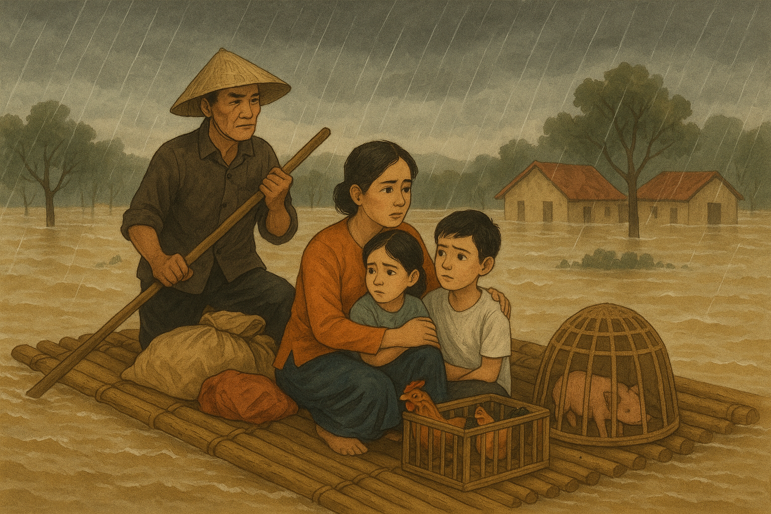 Tôi nhớ lần đầu được ngồi lên bè, khi mới lên sáu tuổi. Đêm ấy, mưa như ôm vò mà xối, nước lên nhanh đến mức không ai kịp trở tay. Cả làng ngập trắng, tiếng chó tru, tiếng người gọi nhau í ới. Mẹ ôm lấy tôi và em trai, bước khẽ lên bè, chân run vì lạnh và vì lo. Cha đi sau cùng, tay cầm cây sào tre dài, ánh đèn pin mờ mờ phản chiếu gương mặt sạm đen, ánh mắt kiên quyết. Cả đêm ấy, chiếc bè trôi lặng lẽ giữa mênh mông nước đục ngầu. Cha không ngủ, tay vẫn giữ sào, mắt nhìn về phía những mái nhà đang dập dềnh. Gió lạnh táp vào mặt, nước mưa đọng thành dòng chảy xuống cổ áo. Nhưng cha không than, chỉ lặng lẽ cúi đầu, thỉnh thoảng kiểm tra dây buộc, xem bè có bị nước lùa vào không. Tôi nằm trong lòng mẹ, nghe tiếng mưa rơi lộp độp lên bè, nghe tiếng lợn kêu enh éc, và thấy bàn tay cha thô ráp, ấm lạ thường, đặt lên mái đầu tôi, nhẹ nhàng.