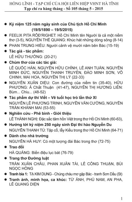 Tạp chí Hồng Lĩnh số 105, phát hành vào đầu tháng 5/2015 hân hạnh giới thiệu