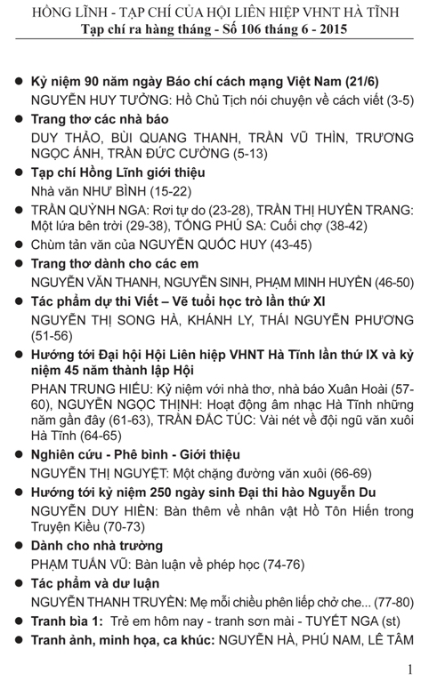 Tạp chí Hồng Lĩnh số 106, phát hành vào đầu tháng 6/2015 trân trọng giới thiệu