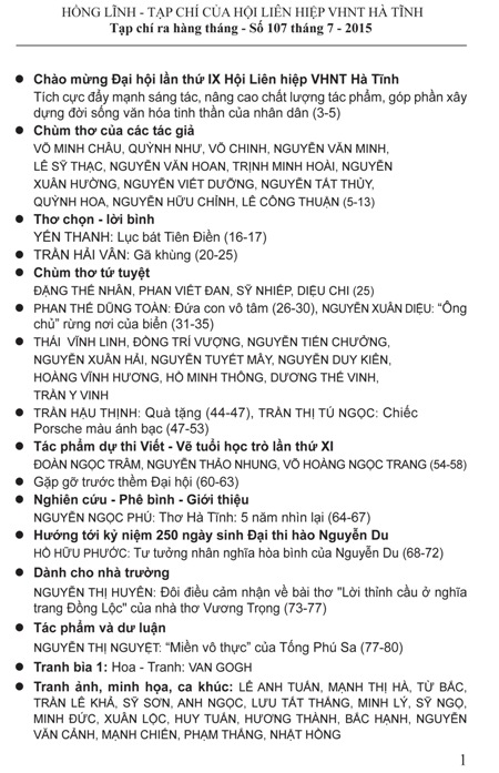 Tạp chí Hồng Lĩnh số 107, phát hành vào đầu tháng 7 năm 2015 chào mừng Đại hội Hội liên hiệp VHNT Hà Tĩnh lần thứ IX trân trọng giới thiệu