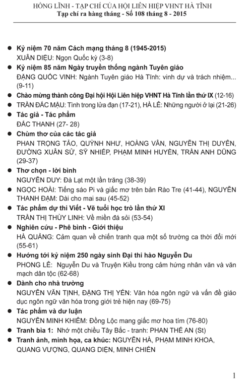 Tạp chí Hồng Lĩnh só 108, phát hành vào đầu tháng 8 năm 2015 hân hạnh giới thiệu