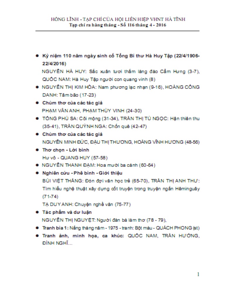 Tạp chí Hồng Lĩnh số 116, phát hành vào đầu tháng 4 trân trọng giới thiệu.