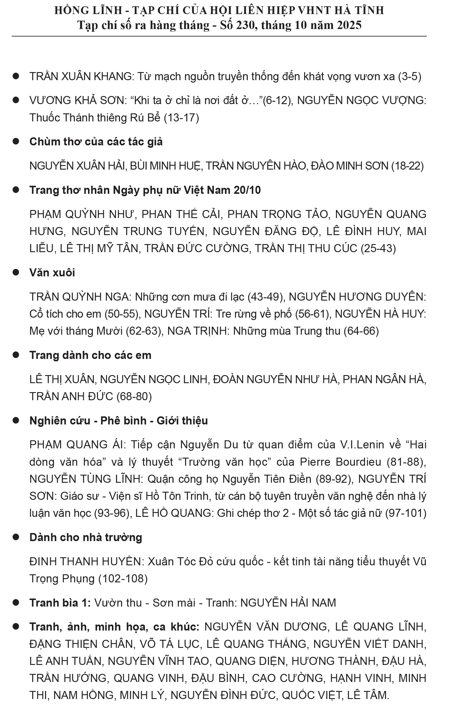 Tạp chí Hồng Lĩnh số 230 phát hành tháng 10/2025 trân trọng giới thiệu