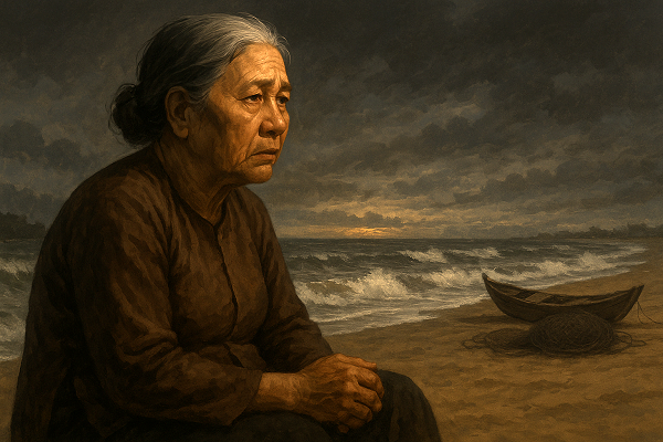 Bà Sáu nhìn day day ra phía biển. Ánh nhìn trân trối xoáy về khoảng sáng tối hư vô. Màn đêm buông chầm chậm, đổ đầy màu tối vào từng ngóc ngách, lan dần từ con đường chạy từ biển vào đến trong hiên nhà. Bà Sáu ngồi lặng yên không nhúc nhích. Kẽ mắt rỉ xuống một dòng nước mắt mờ đục, đọng lại nơi vết chân chim rồi dần khô lại…