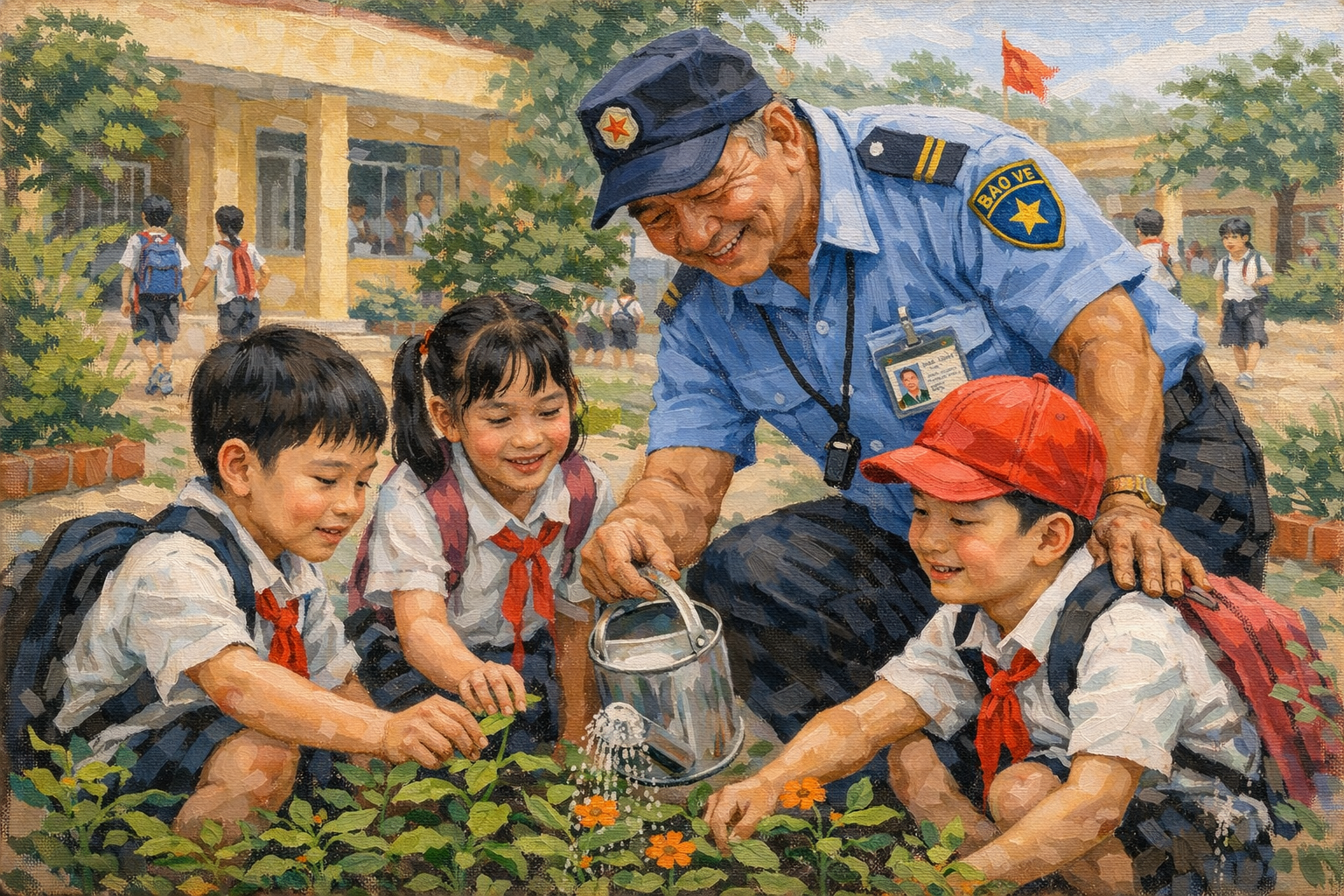 Nắng đầu hạ còn nồng nàn trên các vòm cây, vườn hoa; những bông hoa Osaka, Bông trang rừng, Cúc vàng… muôn màu sắc rực rỡ nở xòe đón nắng và uống từng ngụm nước ngọt ngào từ vòi bơm tay Kha. Hoa phượng đã bắt đầu nở từng chùm đỏ rực như thông điệp gửi chúc mùa thi của học trò. Hôm nay là chủ nhật, Kha khóa cổng trường rồi phóng xe về nhà kèm các cháu học thêm.