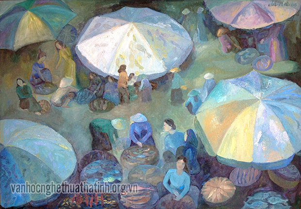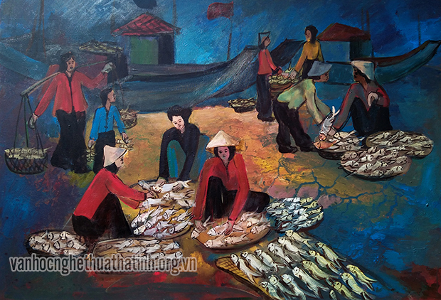 Chợ cá - Sơn dầu - Tranh: Mạnh Thị Hà