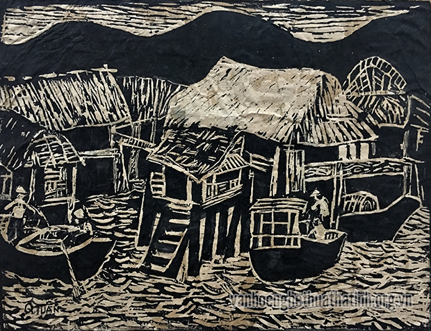Làng ven biển - Khắc gỗ - Tranh: Đặng Quốc Tuấn