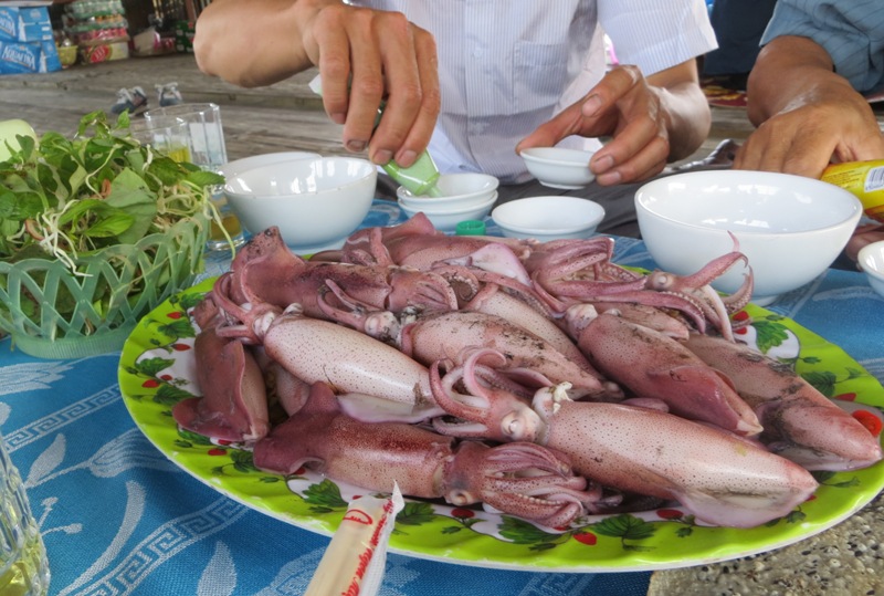 Thật khó cưỡng miệng khi món đặc sản mực nhảy nóng sốt tự tay mình vớt vừa được dọn ra