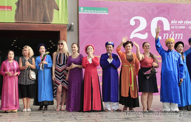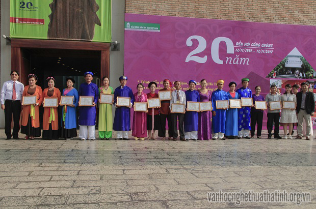 Đại diện của Bảo tàng dân tộc học Việt Nam tặng giấy chứng nhận cho đoàn nghệ nhân Hà Tĩnh đã tham gia vào hoạt động bảo tồn và phát huy di sản văn hóa dân gian trong chương trình Hoạt động kỉ niệm 20 năm mở cửa và đón công chúng.