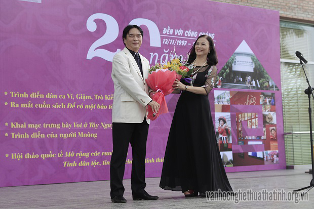 Phó giáo sư, tiến sĩ Võ Quang Trọng - Giám đốc Bảo tàng Dân tộc học Việt Nam tặng hoa chúc mừng bà Phan Thư Hiền - đại diện đoàn nghệ nhân Hà Tĩnh, Chi hội trưởng Chi hội Văn nghệ dân gian Việt Nam tại Hà Tĩnh.