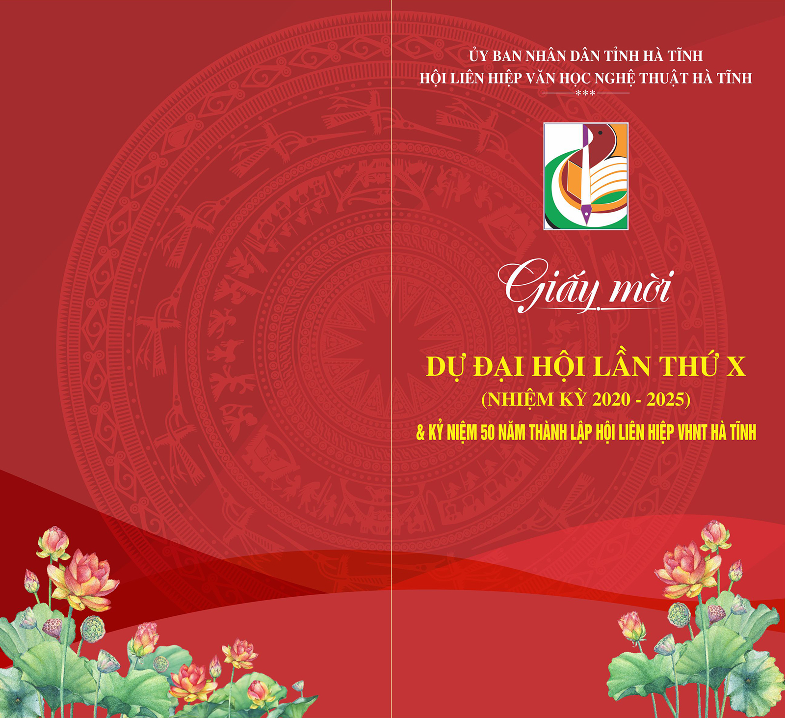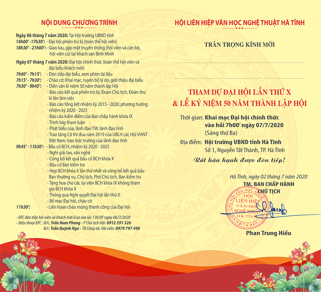 Thực hiện Chỉ thị số 31-CT/TW ngày 22/01/2019 của Ban Bí thư Trung ương Đảng, Hướng dẫn số 87-HD/BTGTWW ngày 25 tháng 03 năm 2019 của Ban Tuyên giáo TW, Hướng dẫn số 75-HD/BTGTU ngày 08 tháng 4 năm 2019 của Ban Tuyên giáo Tỉnh ủy, công văn số 3497/UBND-NC ngày 03 tháng 6 năm 2019 của UBND tỉnh, công văn số 1866- CV/TU ngày 31 tháng 10 năm 2019 và Thông báo số 1295-TB/TU ngày 24 tháng 6 năm 2020 của Thường trực Tỉnh ủy Hà Tĩnh, trân trọng kính mời quý vị đại biểu cùng toàn thể cán bộ hội viên về tham dự Đại hội lần thứ X và kỉ niệm 50 năm thành lập Hội liên hiệp VHNT Hà Tĩnh.