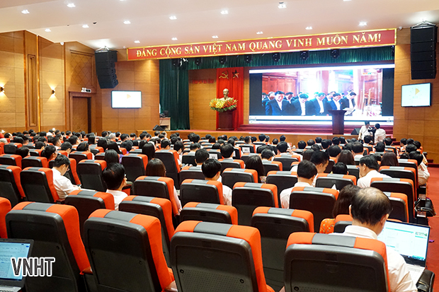 Các đại biểu xem phóng sự: Những kết quả đạt được trong 03 năm thực hiện Kết luận số 01-KL/TW của Bộ Chính trị do Đài Phát thanh và Truyền hình tỉnh thực hiện.