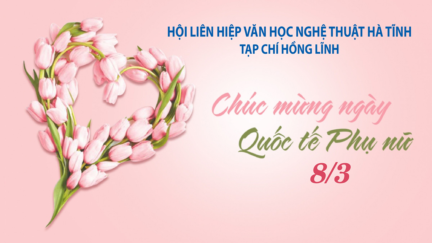 Nhân ngày Quốc tế Phụ nữ 8/3, Hội Liên hiệp Văn học nghệ thuật Hà Tĩnh, Tạp chí Hồng Lĩnh, Trang Website Văn nghệ Hà Tĩnh trân trọng gửi tới các đồng chí nữ cán bộ Hội, hội viên, cộng tác viên lời chúc mừng trân trọng và tốt đẹp nhất! Chúc chị em luôn mạnh khỏe, hạnh phúc, giữ mãi ngọn lửa đam mê sáng tạo văn học nghệ thuật. Kính chúc một ngày 8/3 thật nhiều niềm vui, yêu thương và thành công!