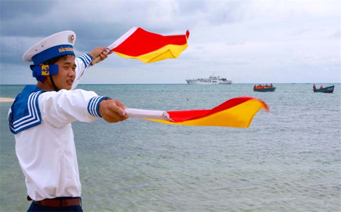 Chiến sỹ tín hiệu hướng dẫn tàu thuyền trên đảo Trường Sa Đông (Quần đảo Trường Sa, Khánh Hòa).