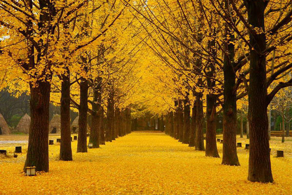 Mùa thu tại ga xép Bu san chấm phá với dăm chậu cúc vàng, vài cây hồng treo đèn lồng đỏ chót ở góc vườn... Hình như càng ngược về phương Bắc, khí thu càng lạnh hơn, cây vặn mình trở lá. Dọc đường đến thủ đô Seoun, cây khoác lên mình áo cà sa, lẫn với sắc đỏ ráng chiều. Nhưng thu thật sự chín khi chúng tôi đặt chân lên đảo Nami, tỉnh Chuncheon, cách Seoul hơn một giờ hành trình... Chao ôi, thiên nhiên đang dọn ra bữa tiệc sắc màu. Vàng tươi hạnh nhân, vàng dịu dàng không chói lóa. Hàng phong cũng nhuộm trời sắc lá đỏ.; vạt đỏ ối, vạt đỏ nâu. Gió thu thổi khẽ, những lá vàng, lá đỏ từ vòm cây rứt cành, xoay xoay, khẽ khàng chao nghiêng trước khi ngã mình xuống mặt đất. Tôi đặt tay lên cây, sờ vỏ cây sần sùi, níu cành, ngắm lá để xác nhận với lòng mình đây là mùa thu vàng trên đảo Na mi chứ không phải là thu vàng trong tranh họa sĩ Levitan. Bạn đọc hãy tha thứ cho tôi, nếu có chút nhầm lẫn giữa nghệ thuật và cuộc sống bởi vì, ở đây cái đẹp nghệ thuật và thiên nhiên hòa làm một. Thì tiếc gì, tôi không chén cho no mắt, đã môi, đầy ngực để từng tế bào khấp khởi theo lá thu, hương thu, hồn thu …