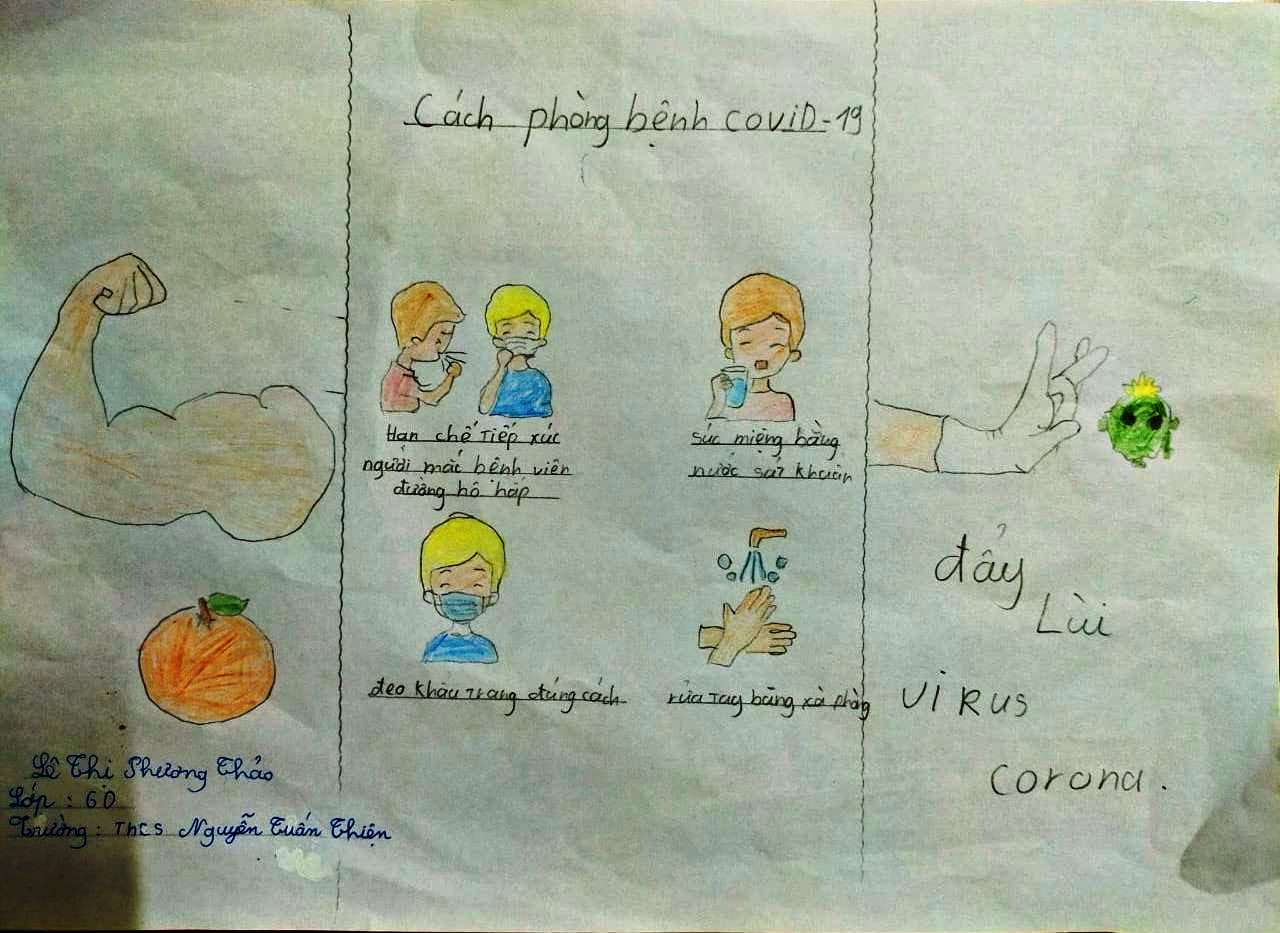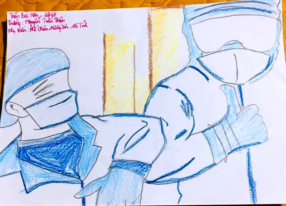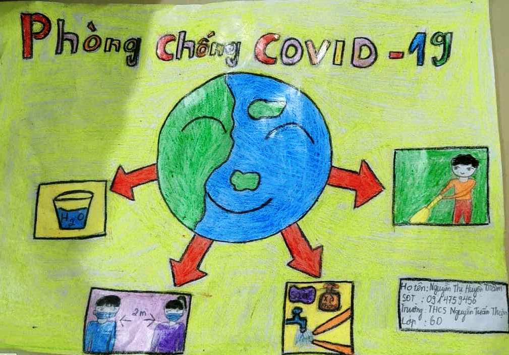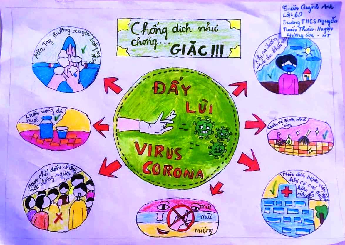 Virus Covid-19 đang trở thành mối đe dọa của toàn nhân loại. Tranh thủ thời gian được nghỉ học ở nhà, ngoài việc học online, các em học sinh lớp lớp 6D, Trường THCS Nguyễn Tuấn Thiện( Hương Sơn, Hà Tĩnh) đã vẽ nhiều bức tranh về phòng, chống dịch bệnh, tạo lan tỏa sâu rộng trong cộng đồng. Những bức tranh thể hiện mong ước về vaccine phòng bệnh, biết ơn sự hy sinh cao cả của đội ngũ y bác sĩ ở tuyến đầu, đề cao tình đoàn kết, sự san sẻ yêu thương, tình người trong cuộc chiến chống lại Covid-19 cũng như phương pháp giúp phòng, chống dịch bệnh. Văn nghệ Hà Tĩnh hân hạnh giới thiệu chùm tranh của các em về chủ đề này!