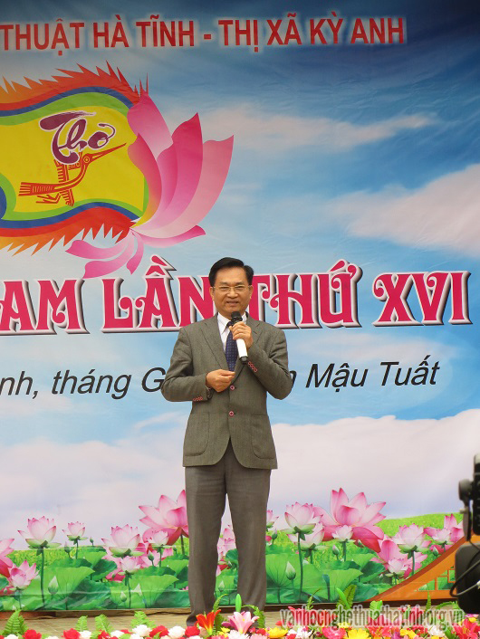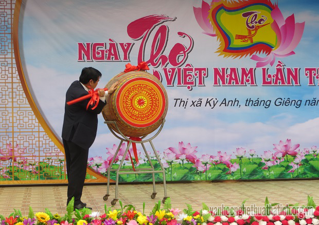 Phó Chủ tịch UBND tỉnh Đặng Quốc Vinh đánh trống khai hội sau phát biểu khi mạc của Nhà văn Phan Trung Hiếu - Bí thư Đảng đoàn, Chủ tịch Hội liên hiệp Văn học Nghệ thuật Hà Tĩnh .