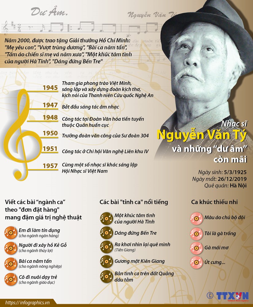 Với những giai điệu mượt mà, đậm chất dân ca, các sáng tác của nhạc sỹ tài hoa Nguyễn Văn Tý như các ca khúc: Một khúc tâm tình của người Hà Tĩnh, Người đi xây hồ Kẻ Gỗ... luôn được khán giả yêu mến. Ông sinh vào ngày này cách đây 95 năm, ngày 5/3/1925.