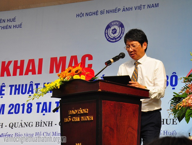 Chủ tịch Hội NSNA Việt Nam Vũ Quốc Khánh phát biểu khai mạc triển lãm.