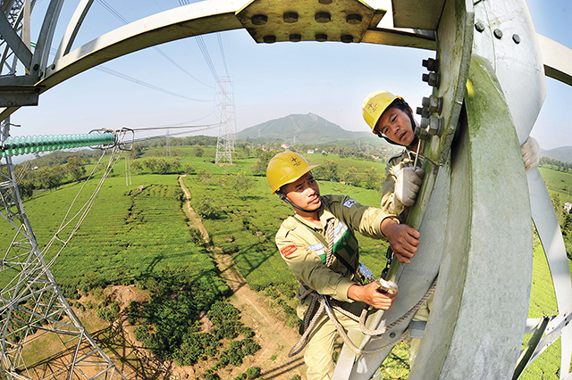 Công Nhân EVN - NPT bảo dưỡng đường dây 500 kV Phú Thọ - Yên Bái. Ảnh: Trần Thanh Hải