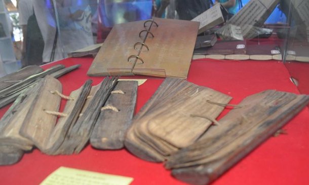 Sách lá buông có thể mở ra như quạt, gồm nhiều mảnh lá xâu lại thành tập dày, có thể lật tửng mảnh ra đọc, cả hai mặt lá đều có chữ khắc - sẽ được trưng bày tại Thư viện Quốc gia Việt Nam.