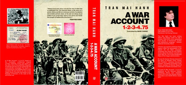 Ảnh bìa cuốn Biên bản chiến tranh 1-2-3-4.75 - Phiên bản tiếng Anh – Trên bìa là Phóng viên TTXVN Trần Mai Hạnh (đeo kính) cùng các đồng nghiệp Thông tấn xã Giải phóng tại cửa ngõ Sài Gòn sáng sớm 30/4/1975