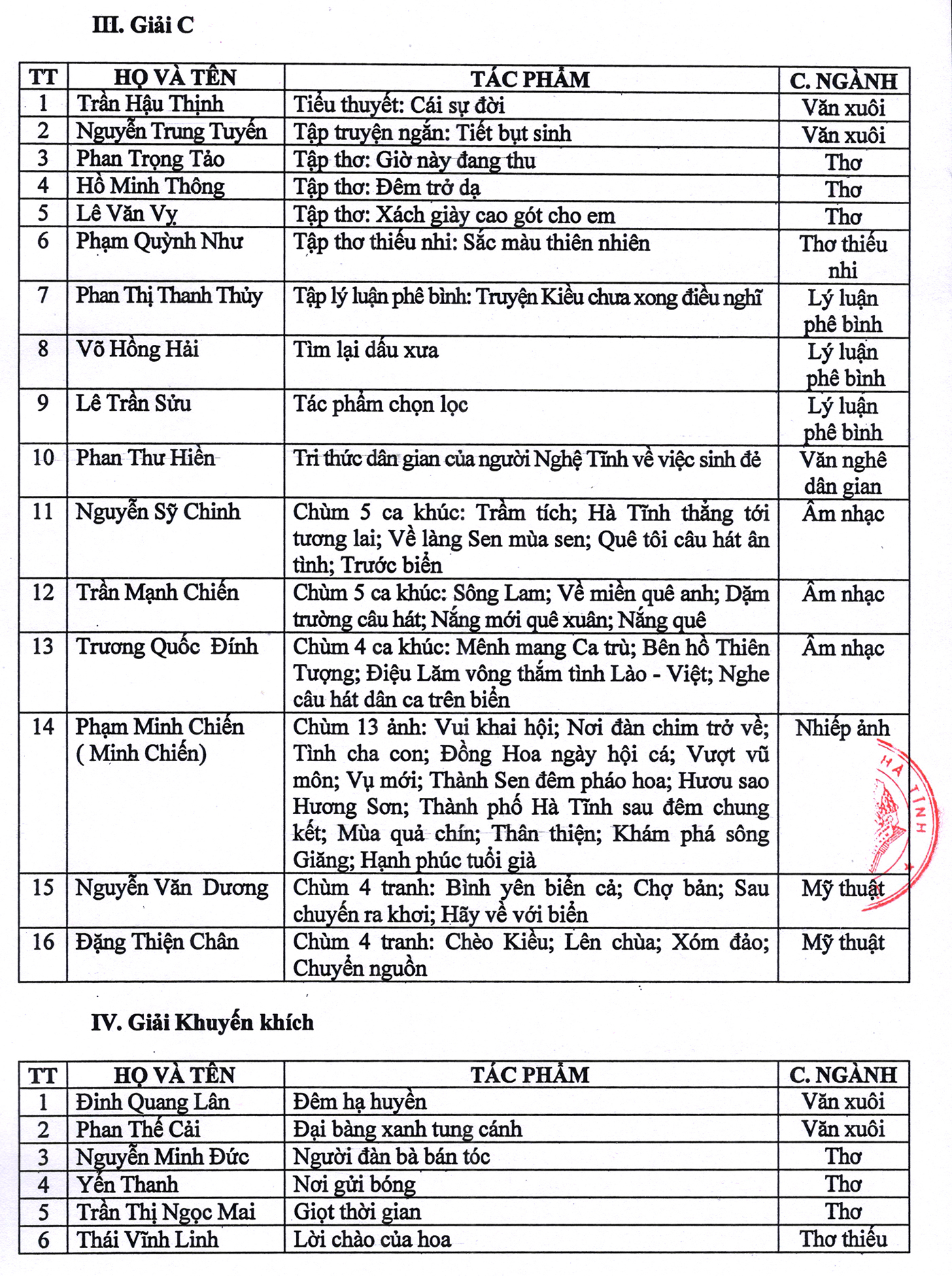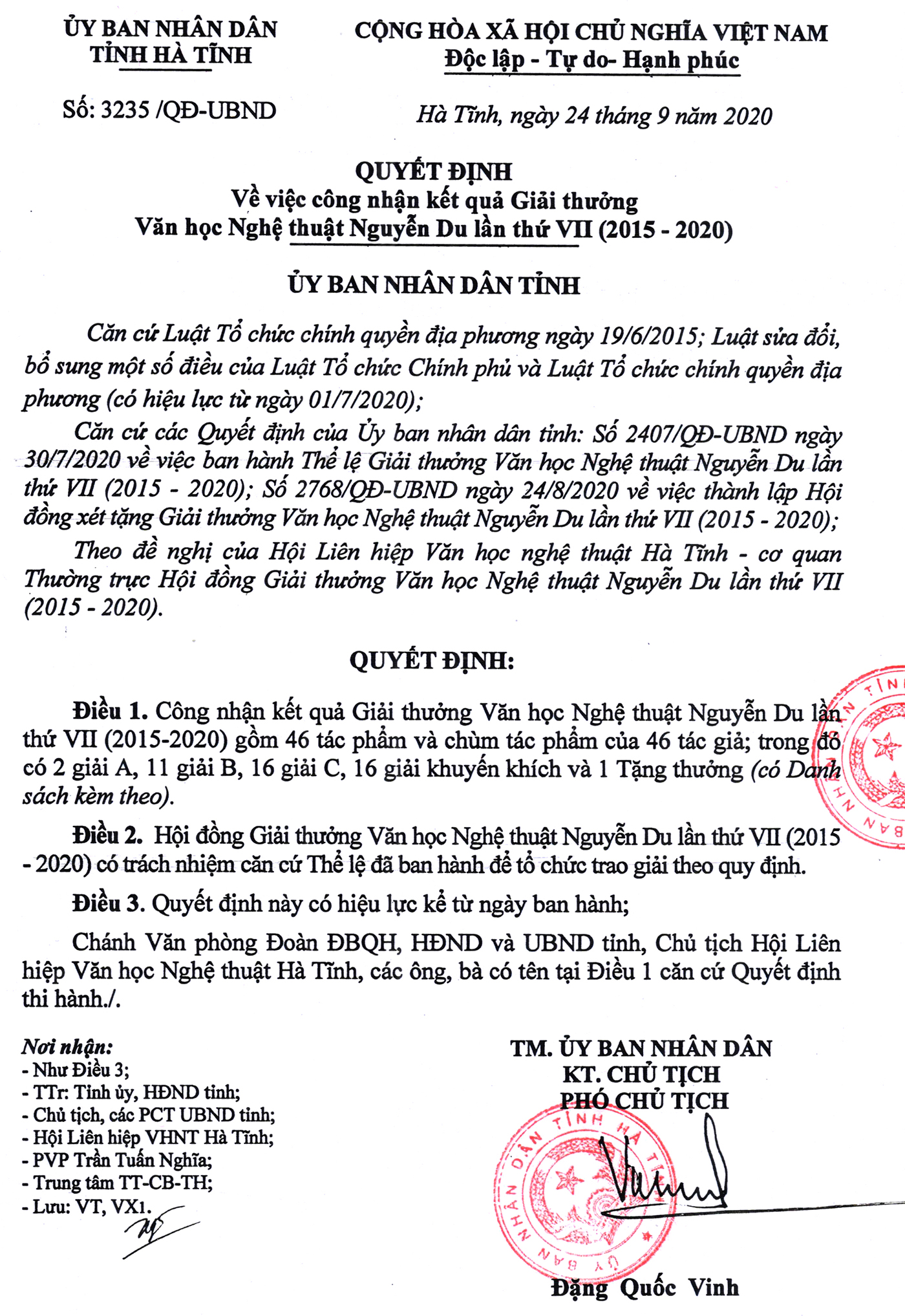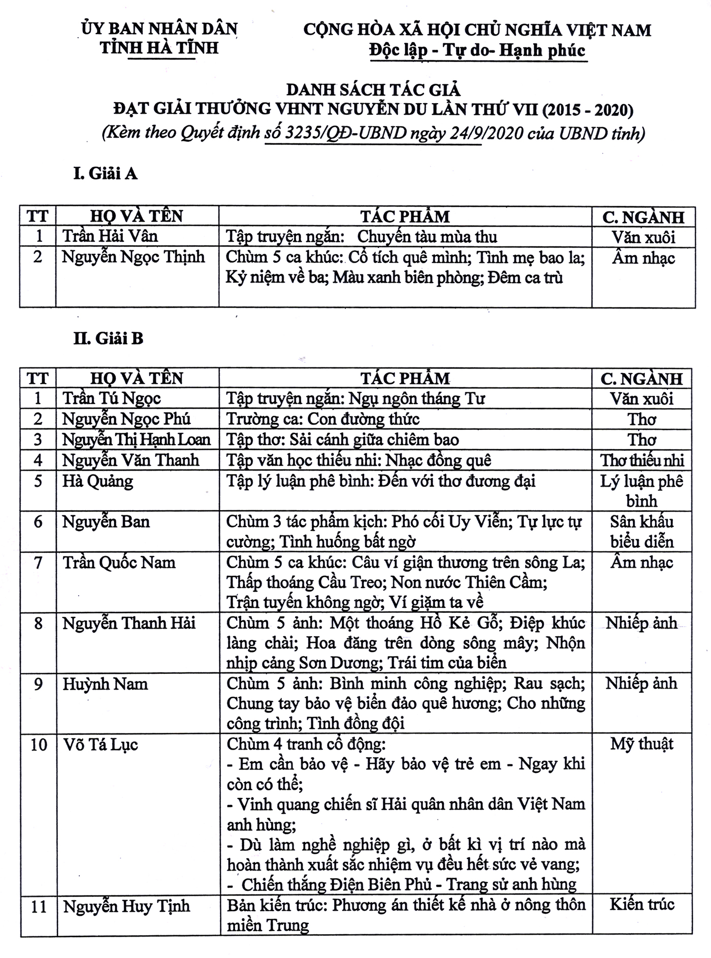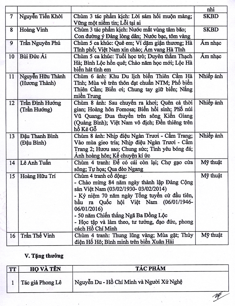 Hội đồng Giải thưởng VHNT Nguyễn Du lần thứ VII; Hội Liên hiệp VHNT Hà Tĩnh trân trọng thông báo kết quả Giải thưởng (kèm theo quyết định số 3235/QĐ-UBND ngày 24/9/2020 của UBND tỉnh Hà Tĩnh) để các tác giả dự giải, cán bộ, hội viên Hội Liên hiệp VHNT Hà Tĩnh và mọi người quan tâm được biết.