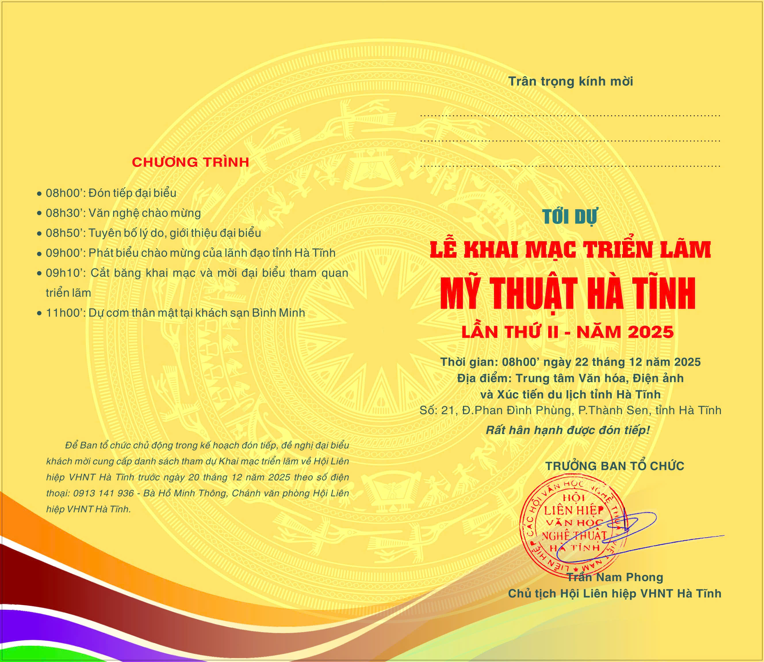 Trân trọng kính mời quý vị đại biểu, cán bộ, hội viên Hội Liên hiệp VHNT Hà Tĩnh và mọi người quan tâm tham dự!