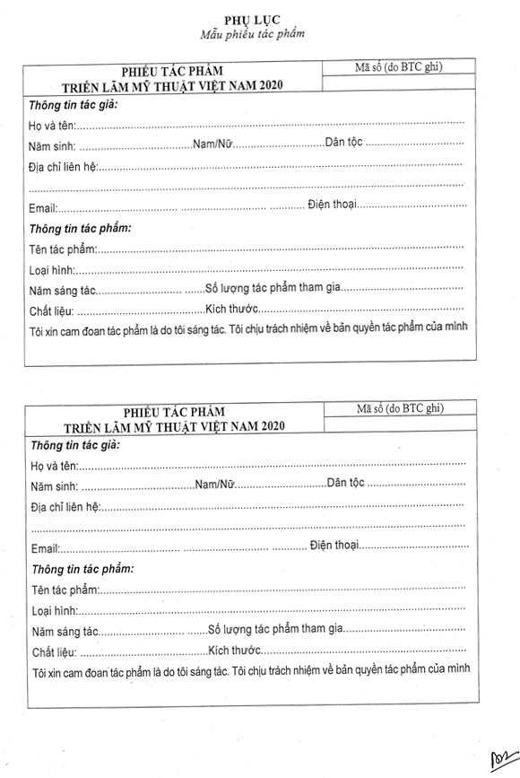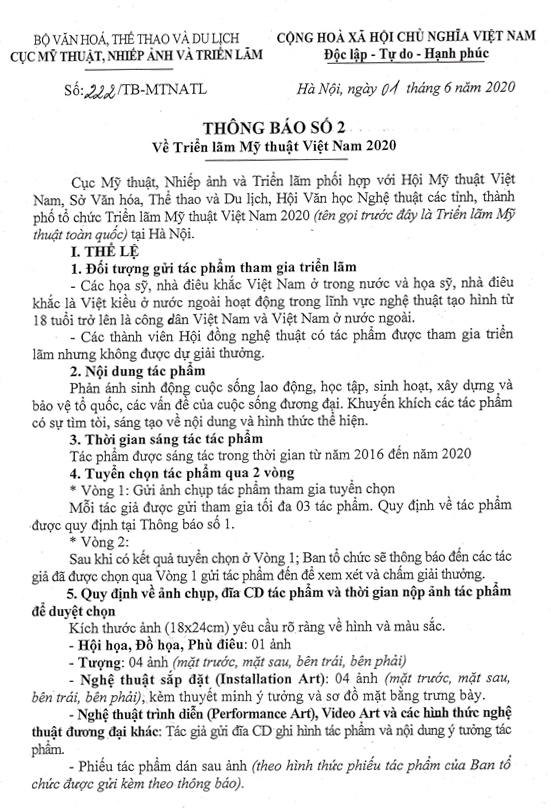 THÔNG BÁO SỐ 2 VỀ TRIỂN LÃM MỸ THUẬT VIỆT NAM NĂM 2020