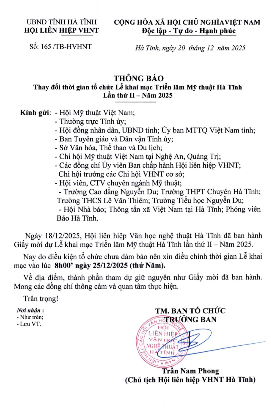 Ngày 18/12/2025, Hội liên hiệp Văn học nghệ thuật Hà Tĩnh đã ban hành Giấy mời dự Lễ khai mạc Triển lãm Mỹ thuật Hà Tĩnh lần thứ II – Năm 2025. Nay do điều kiện tổ chức chưa đảm bảo nên xin điều chỉnh thời gian Lễ khai mạc vào lúc 8h00’ ngày 25/12/2025 (thứ Năm). Về địa điểm, thành phầm tham dự giữ nguyên như Giấy mời đã ban hành. Mong các đồng chí thông cảm và quan tâm thực hiện. Trân trọng!