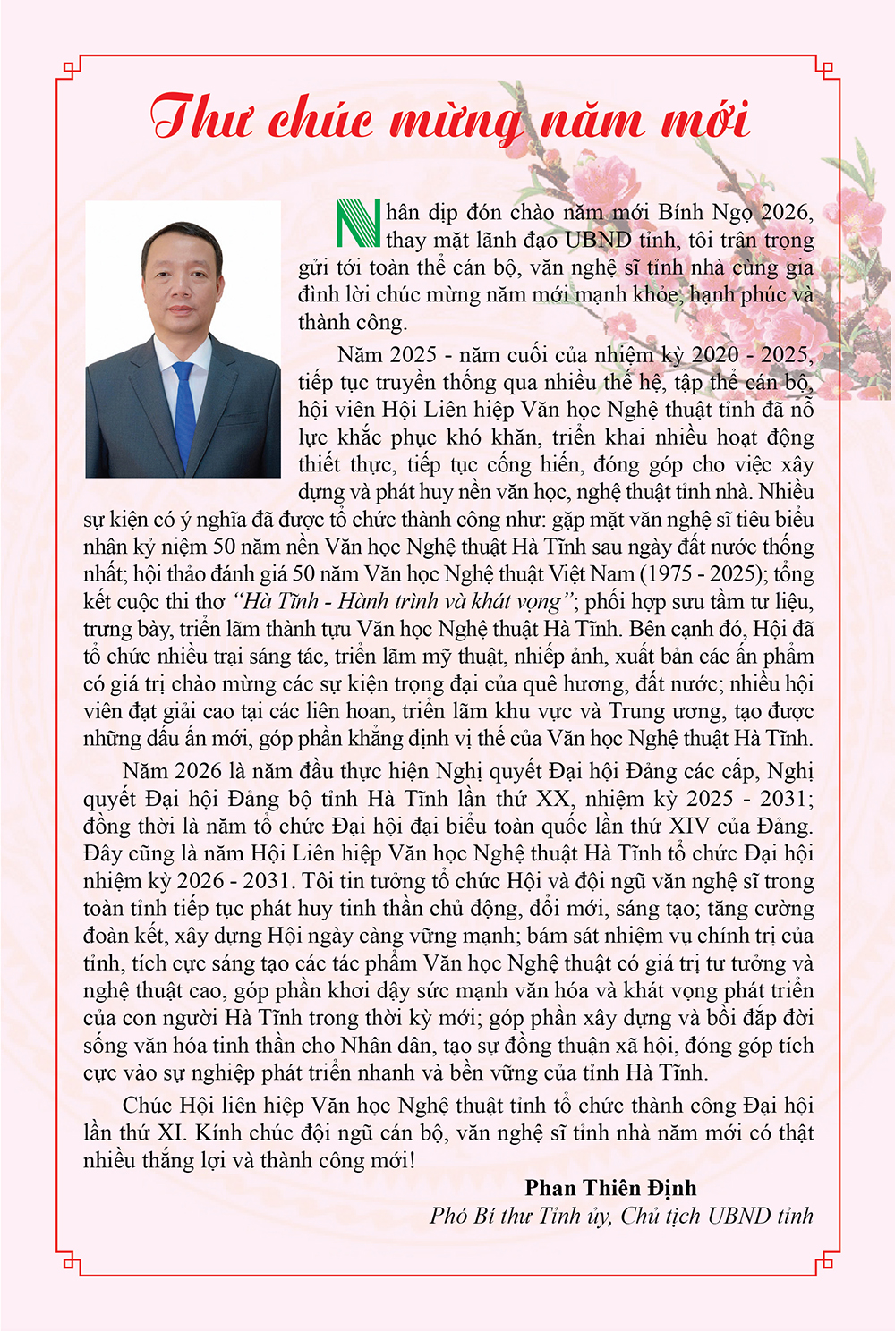 Tạp chí Hồng Lĩnh số Tết Bính Ngọ 2026 trân trọng Thư chúc Tết năm 2026 của đồng chí Phan Thiên Định - Phó Bí thư Tỉnh ủy, Chủ tịch UBND tỉnh Hà Tĩnh gửi tới toàn thể cán bộ, hội viên, văn nghệ sĩ tỉnh nhà.