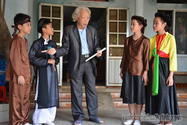 Nghệ nhân Trần Khánh Cẩm truyền dạy hát ví o Nhẫn cho các em học sinh trường THCS Kỳ Tân - huyện Kỳ Anh