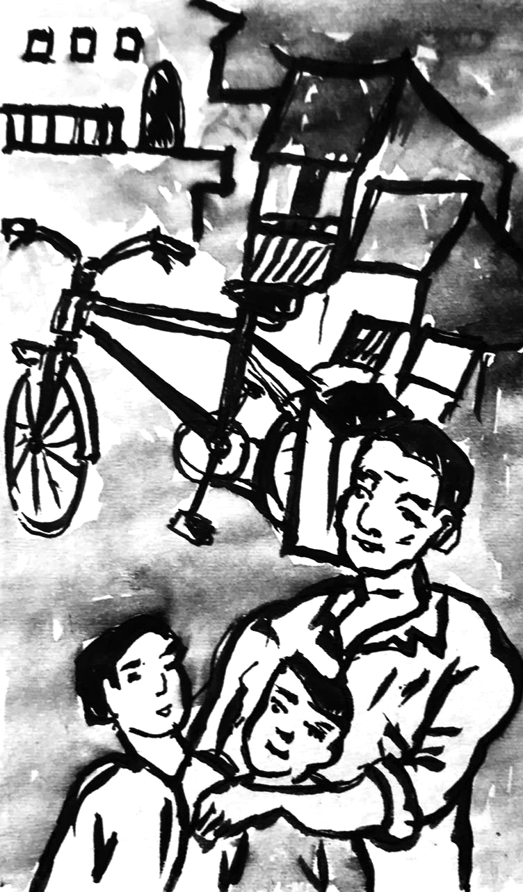 Tí cũng không kìm được, nhảy cẫng lên, vòng tay ôm chặt lấy ba rồi lại quay sang ôm em. Chúng rối rít sờ vào từng chỗ trên chiếc xe, từ cái chuông leng keng, cái yên bọc da mới đến chiếc ghi-đông đã được đánh bóng. Cả hai ríu rít như chim non trong tổ.