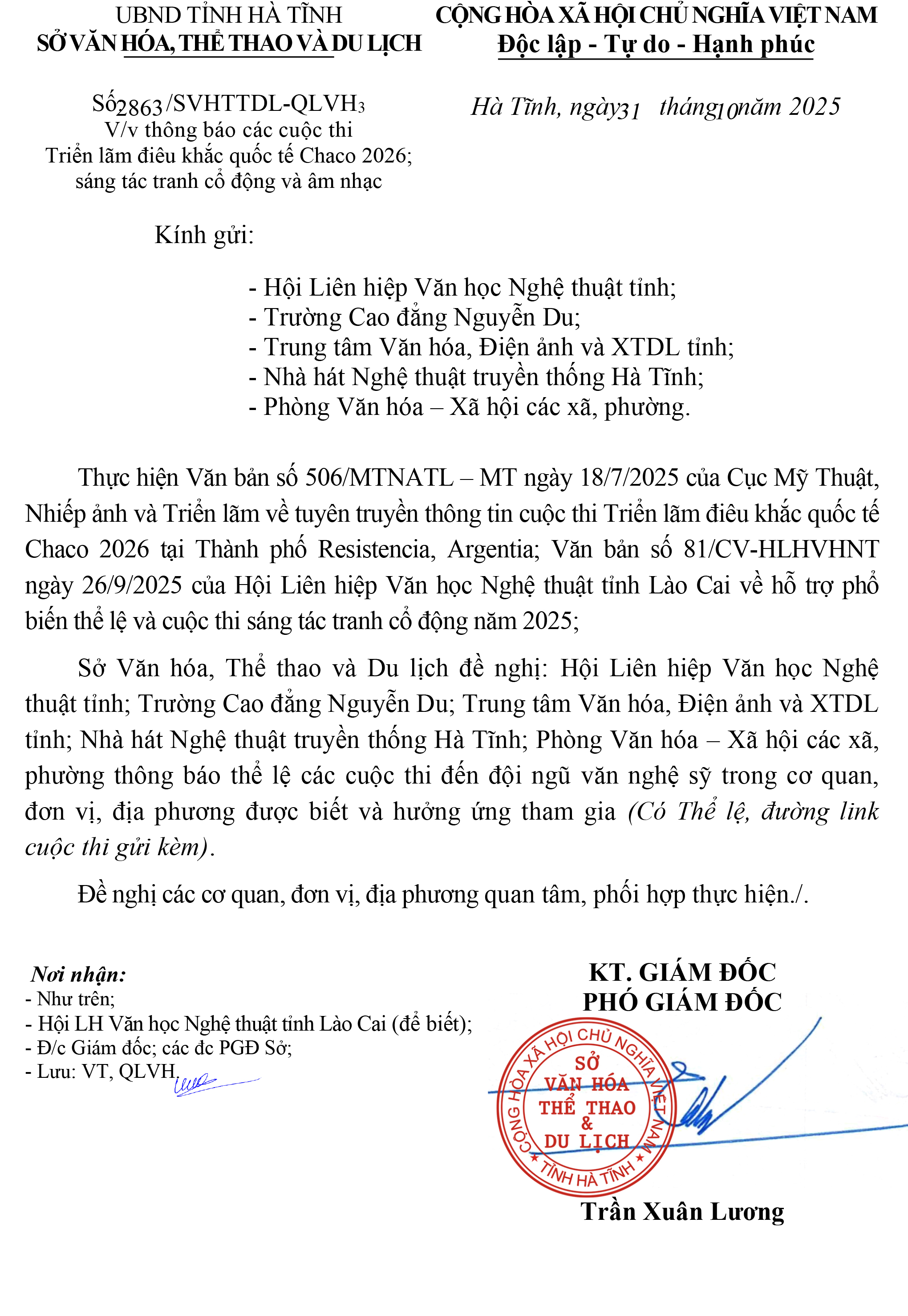 Văn nghệ Hà Tĩnh trân trọng thông báo công văn số 2863/SVHTTDL-QLVH3 ngày 31 tháng 10 năm 2025 của Sở Văn hóa, Thể thao và Du lịch Hà Tĩnh V/v thông báo các cuộc thi Triển lãm điêu khắc quốc tế Chaco 2026, sáng tác tranh cổ động và âm nhạc tỉnh Lào Cai