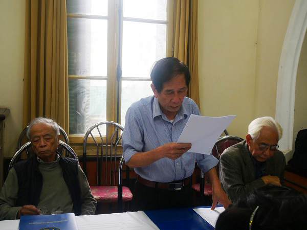 Nhà văn Đỗ Kim Cuông, Phó Chủ tịch Thường trcực Liên hiệp các Hội VNNT Việt Nam báo cáo với Đoàn kiểm tra kết quả 5 năm triển khai, thực hiện nghị quyết 33-NQ/TW khóa XI tại Hội Liên hiệp VNNT Việt Nam